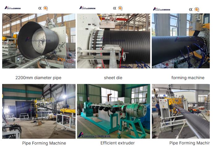The Comrise Sewage and Drainage Solid Wall Spiral Winding HDPE Pipe Machine produced by Comrise machinery is mainly used to produce underground jacking pipes, hollow wall winding pipes with thick wall thickness, Naylor pipes, imitation karat pipes, double plastic composite pipe joints, and insulation pipes with thin-walled tubes. The thickness of the tube can be adjusted by adjusting the thickness and distance of the sheet. The operation is flexible and simple, and tubes of different thicknesses and diameters can be produced at will.